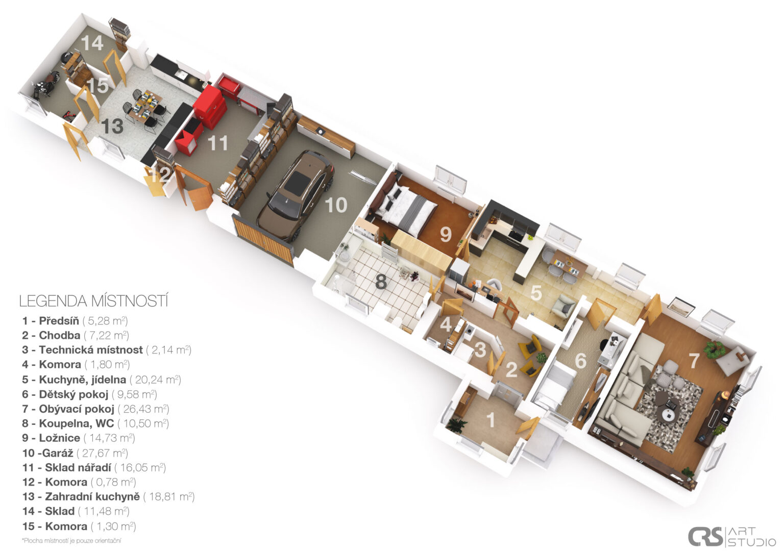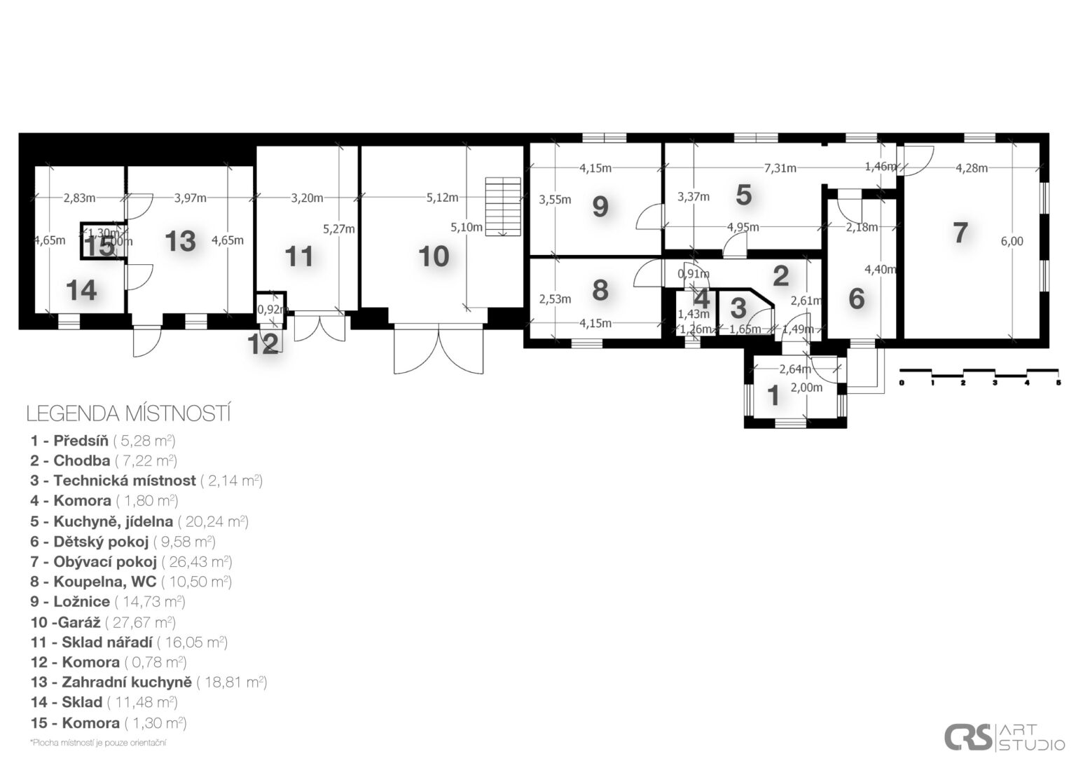 Obytná část má nyní 3+1 a 98m2 v přiložených plánech najdete rozměry jednotlivých místností, obytnou část je možné rozšířit směrem na půdu a nebo místo garáže a venkovní kuchyně.