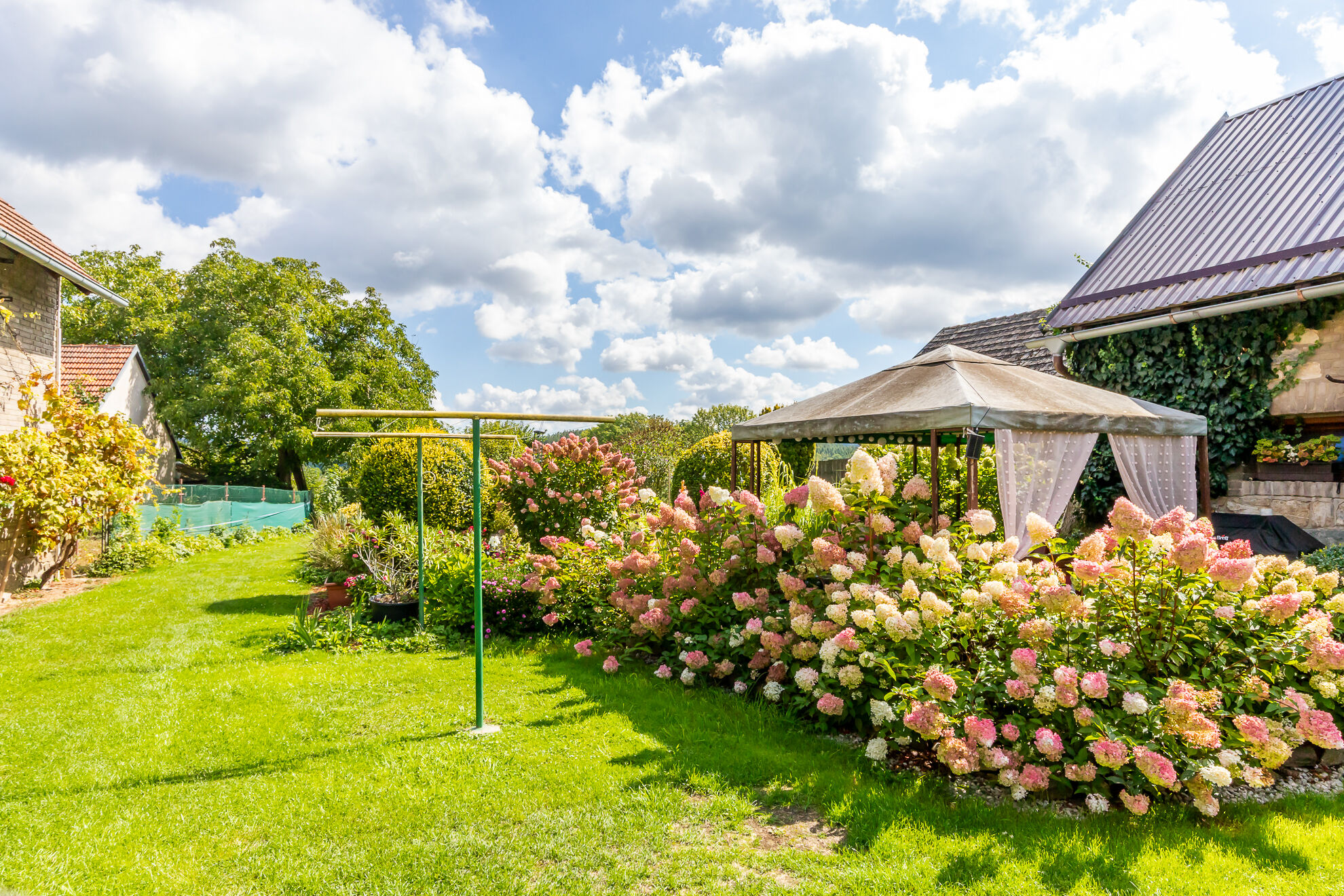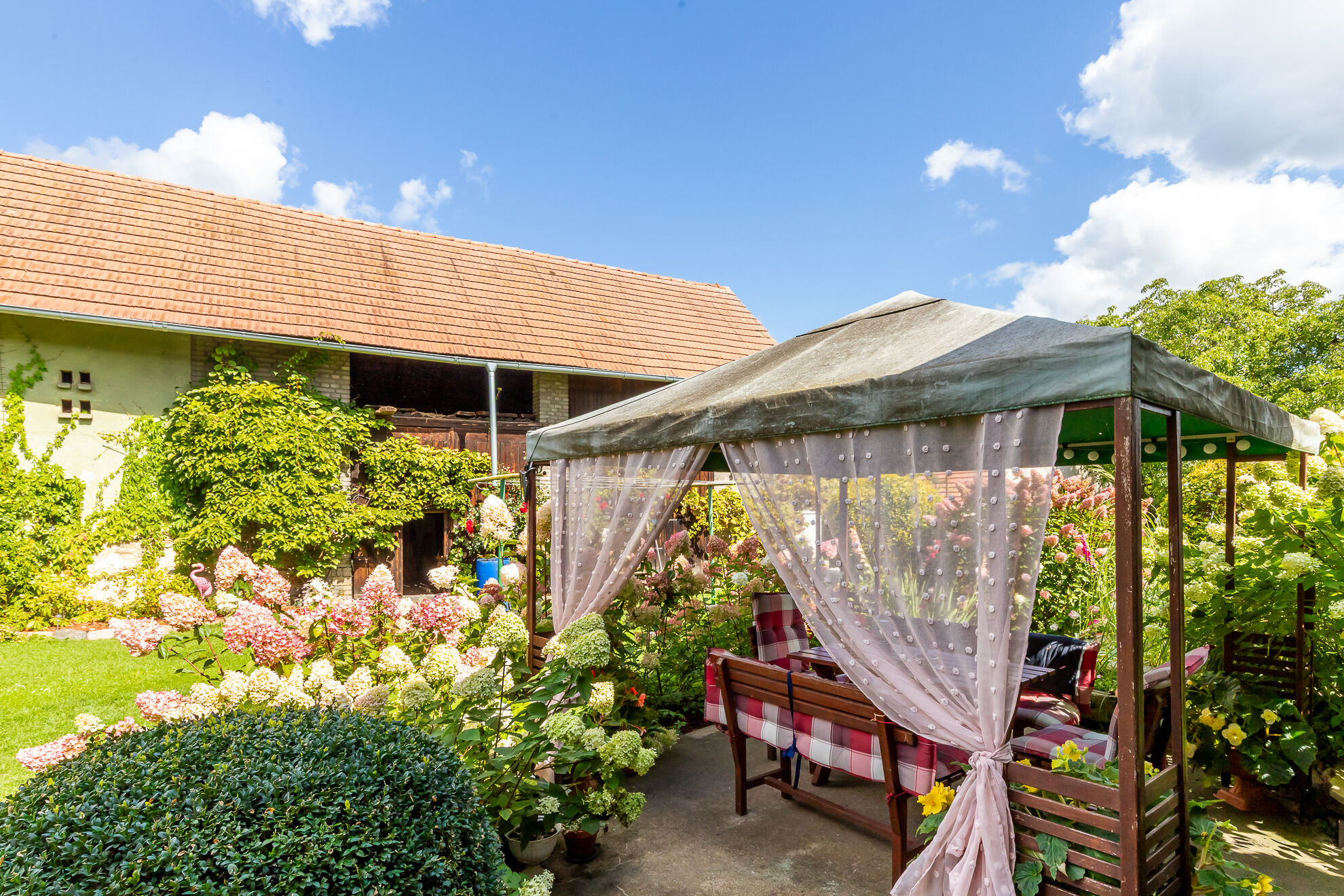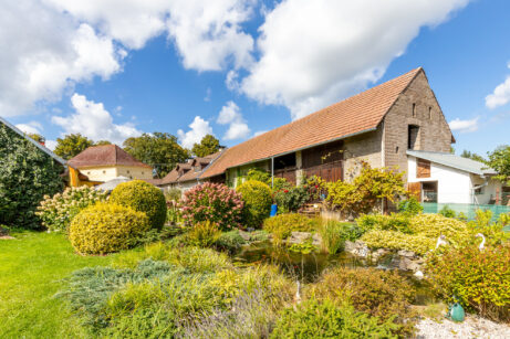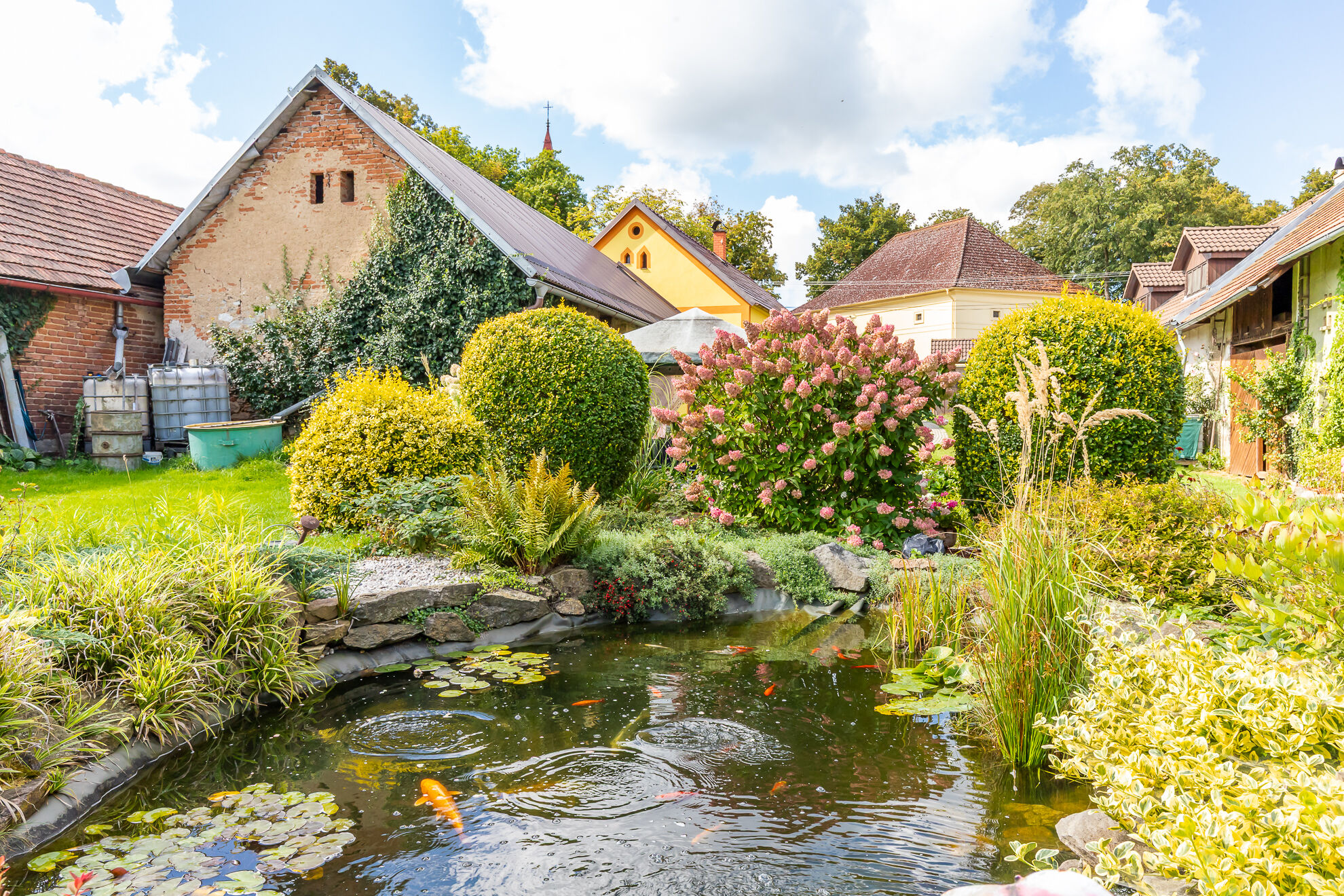 Na pozemku najdeme jezírko s koi kapry, kurník pro slepice, venkovní altán a spoustu zeleně.